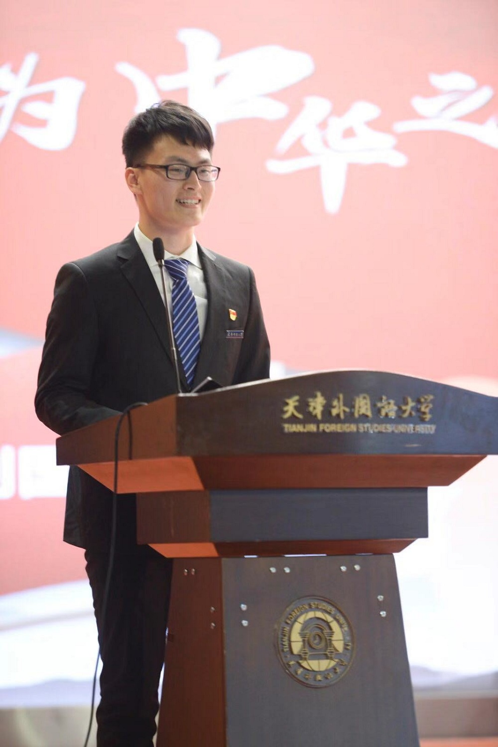 2018年,经学院、学校、天津市组织的层层选拔,因英语能力突出,他成为了一名光荣的2018天津夏季达沃斯论坛外方志愿者,任职北京T2航站楼的调度员,负责接待外宾,调度大巴运行,因表现优异被外方团队举荐参评下一届论坛外方领队,选拔比例接近10000:1。志愿服务最艰难的三天里,他只睡了15个小时,在岗位上坚守了25个小时,胃炎犯了,脚磨破了,没空吃饭了,他都努力坚持了下来。他的坚守,让他多次收到与会的外宾感谢,甚至一位外国年迈的老奶奶特意现学中文向他表示感谢。