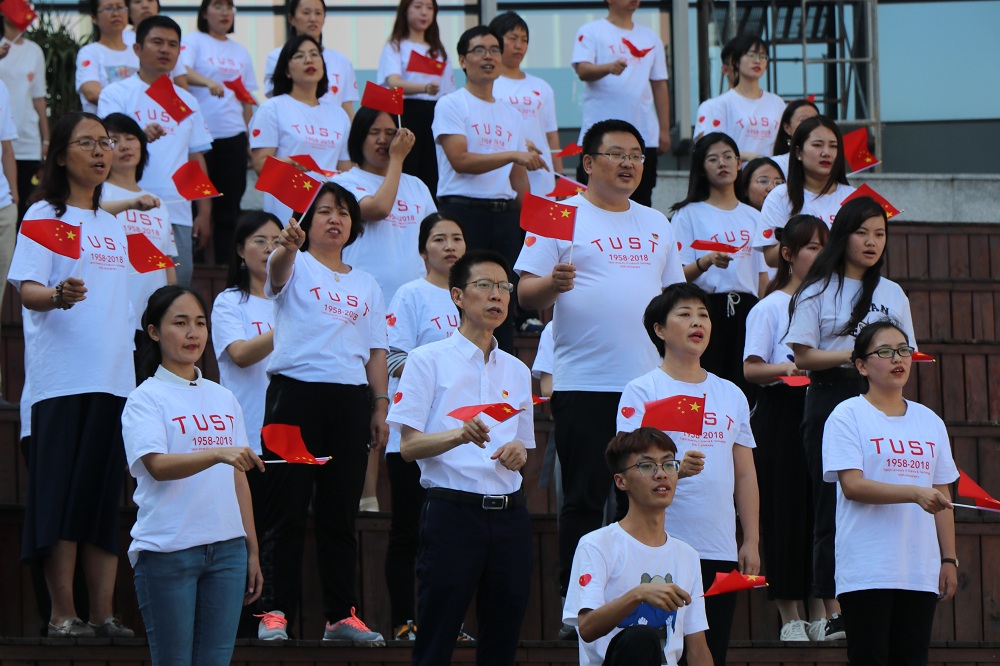 活动伊始,海洋与环境学院全体教职工及部分学生代表在泰达中校区体育馆前广场,手持小国旗,同唱《我和我的祖国》。一张张笑脸在挥舞的国旗下分外灿烂,一段段旋律如同蝴蝶翩跹振动着翅膀,引起无数的心脏与之共鸣,将快闪活动持续推向高潮。